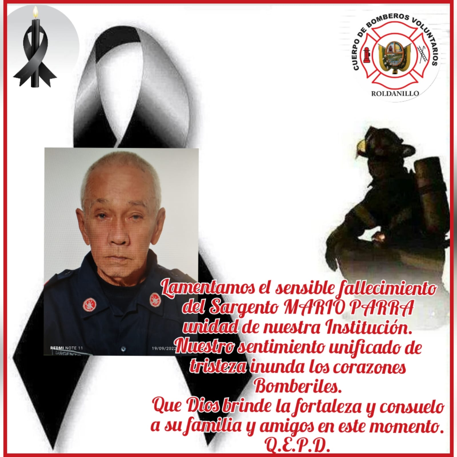 El Benemérito Cuerpo de Bomberos Voluntarios de Roldanillo, Valle del Cauca, expresa sus condolencias a los familiares y amigos, por la partida de nuestro compañero y amigo Sargento PARRA MARIO, quien dejó el legado como herencia a las futuras generaciones del servicio desinteresado, con amor y voluntad para nuestra comunidad Roldanillence.
